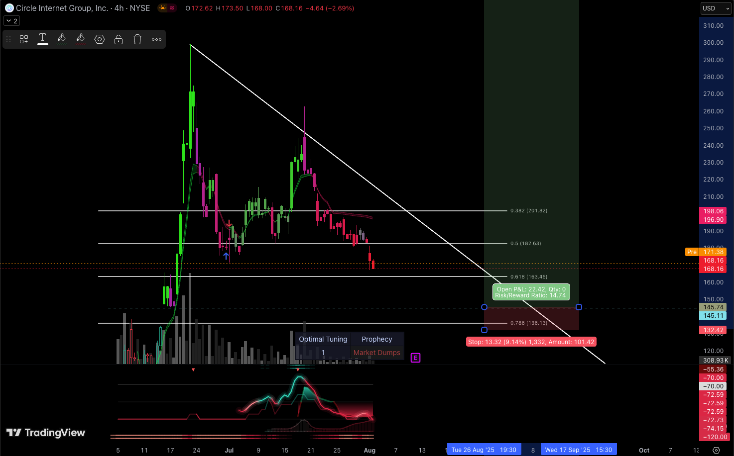 The Big Picture (Recent Movement): CRCL had a big run-up in July, but it's been pulling back significantly since then, just like coming down a steep hill. It's also been respecting a strong downward trend line (that diagonal white line), which acts as a ceiling.