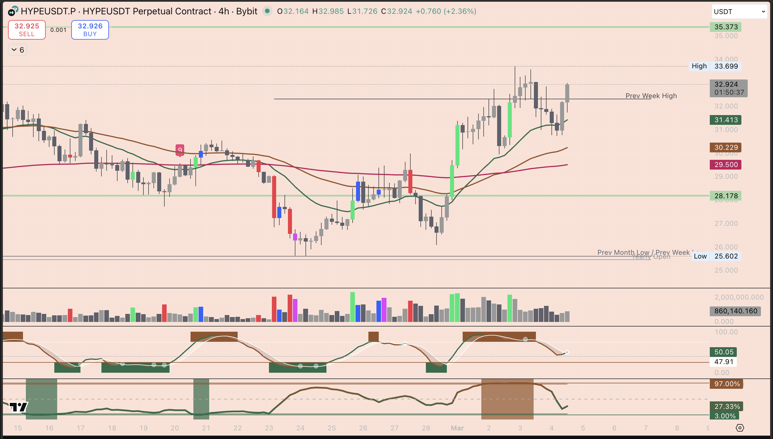As of today, HYPE is trading around $32.90. It recently 21% most other "Layer 1" coins. On the 4-hour chart, you can see it’s been climbing a steady "staircase" upward, even while the rest of the market is dealing with a lot of geopolitical stress.