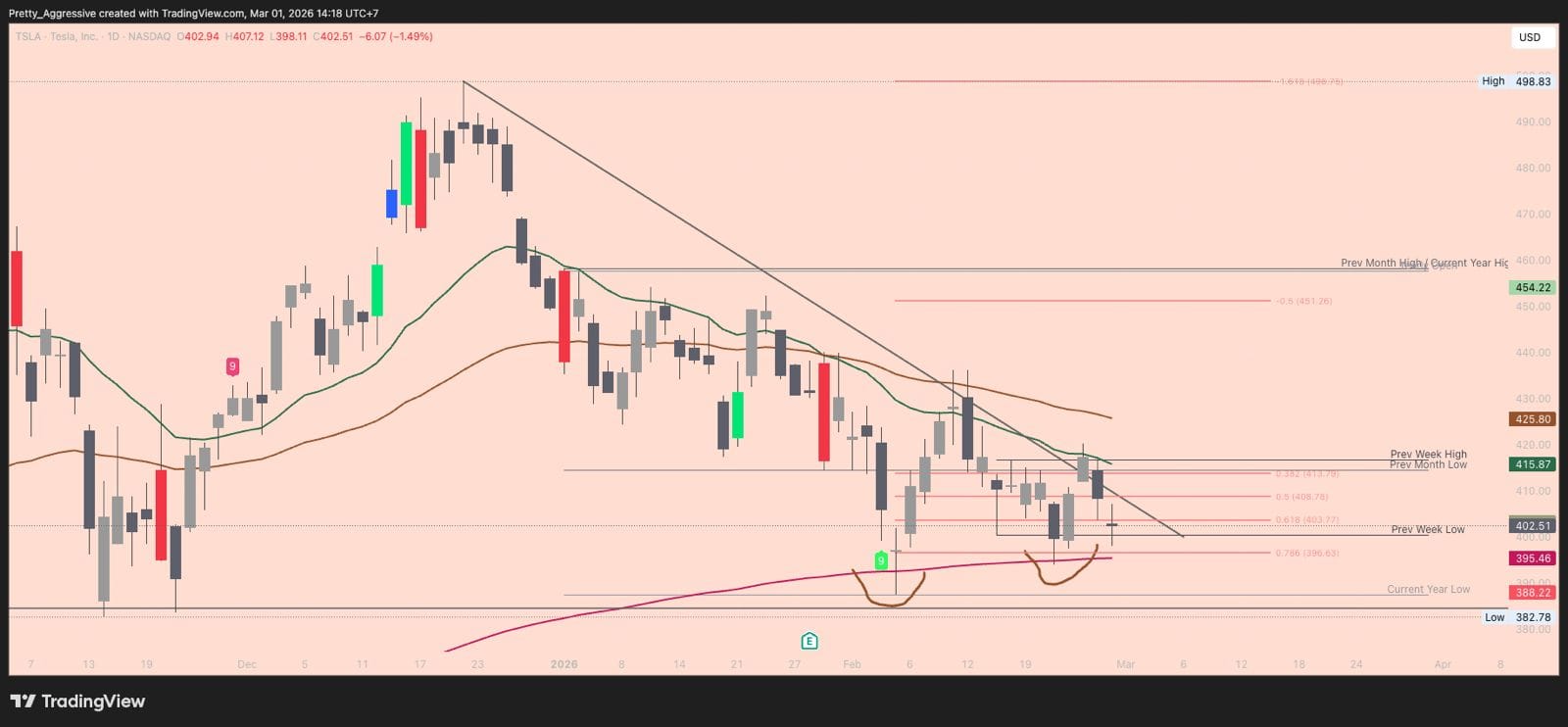 - The Higher-Low: If Tesla dips but manages to stay above yesterday’s low of $398, and starts moving back up, that’s our green light!